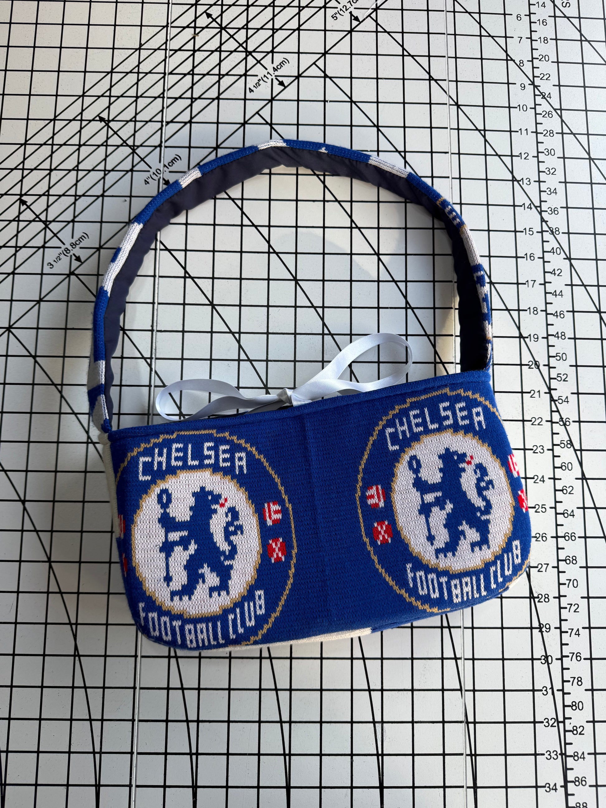 Show off your Chelsea spirit with this unique scarf shoulder bag from an up-cycled Chelsea scarf. Blending the passion of football with a statement piece, this bag is a must-have for fans and fashion-forward individuals alike.