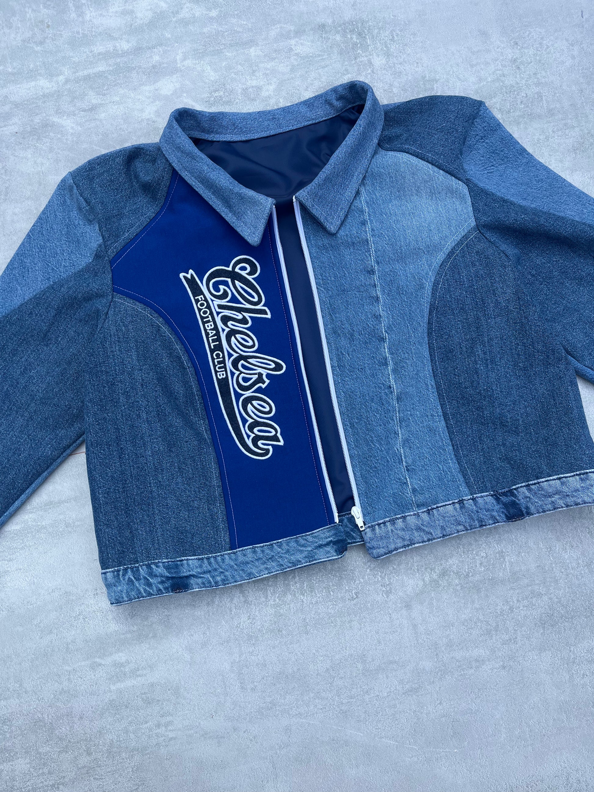 Show off your Chelsea spirit with this unique Moto jacket crafted from an up-cycled Chelsea t shirts and denim jeans. Blending the passion of football with bold streetwear style, this jacket is a must-have for fans and fashion-forward individuals alike.
